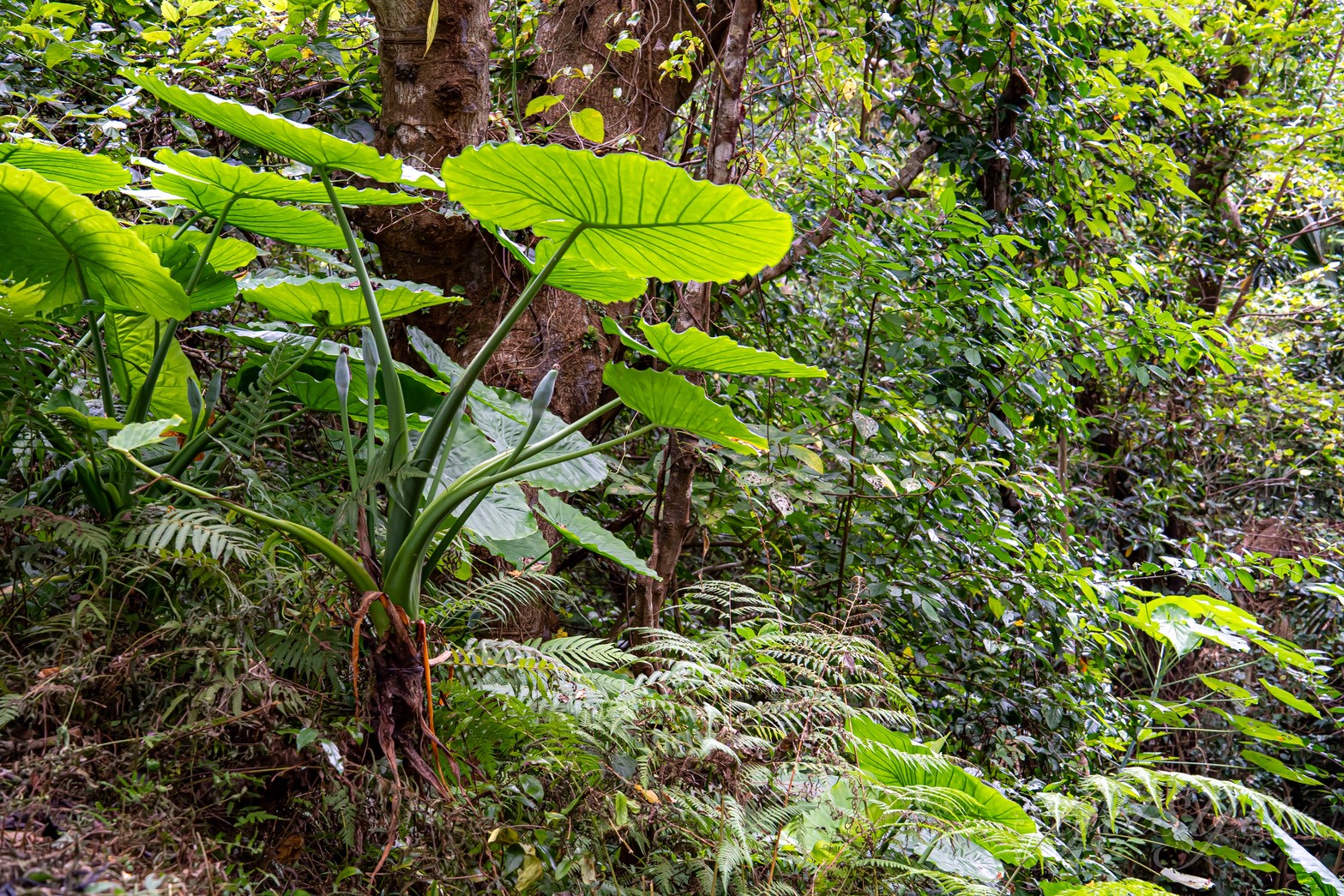 サトイモのような見た目の植物は、クワズイモ。観葉植物でもアロカシアという名前で見かける仲間だが、食わず芋という名の通り、シュウ酸カルシウムという毒を持っており、食べたら食中毒、皮膚に触れるだけでも炎症を起こすという厄介なもの。奄美大島では森の中に限らず、道路脇など至る所に普通に生えていた。
