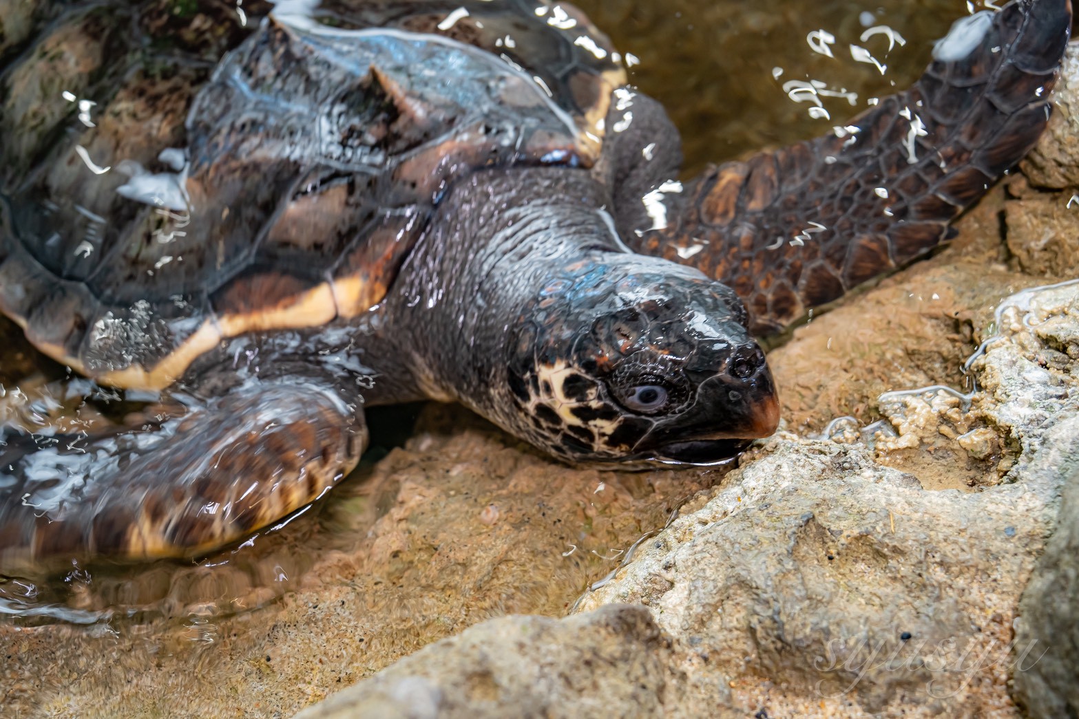 この水族館をおすすめポイントは、入館するともれなくこのウミガメたちに餌やりすることができる。