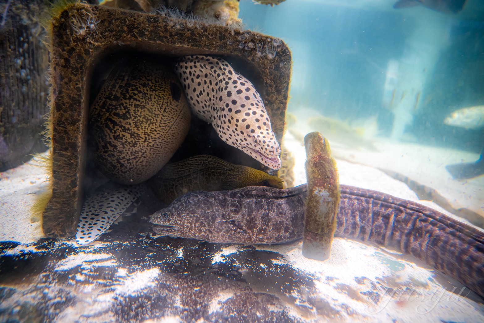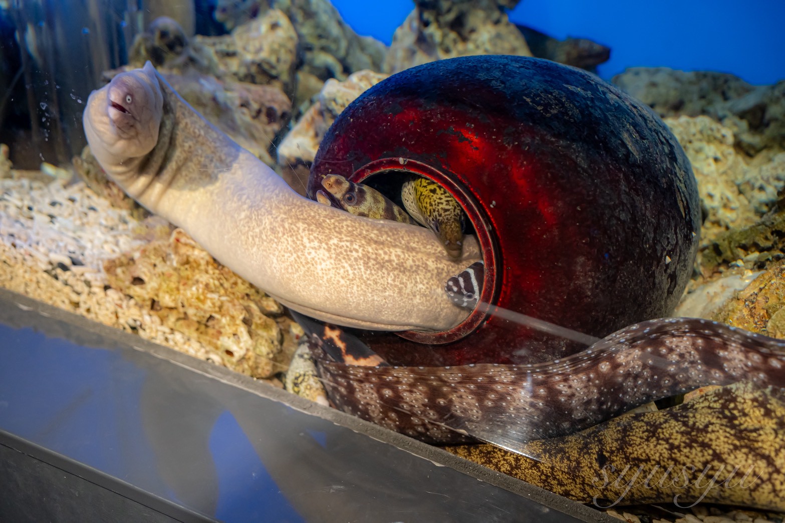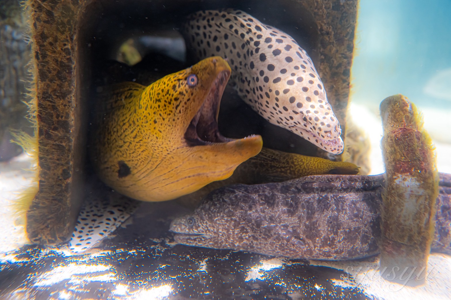 大水槽の奥に進むと、小さな水槽が並ぶアクアリウムゾーン。様々な種類の魚がいるのだが、かなりの種類のウツボが飼育されていた。この黄色いウツボは写真を撮られるのが苦手みたい。