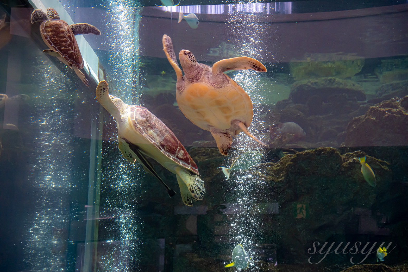 入るといきなりメイン展示、ウミガメが泳ぐ大水槽がある。