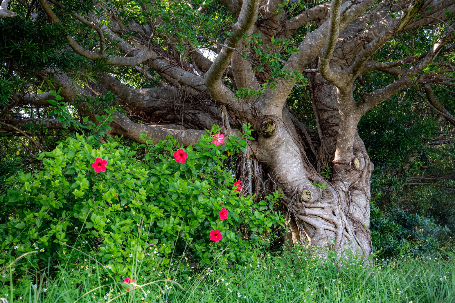 ハイビスカスとアコウの木。普通の公園の風景も南国風情。