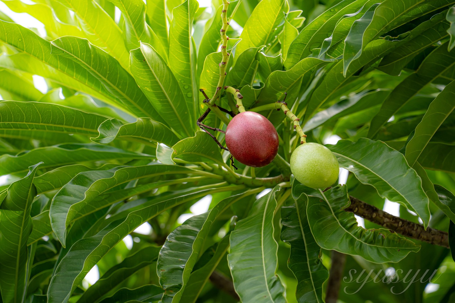 オキナワキョウチクトウという植物の実。シーマンゴーと呼ばれたり、パッションフルーツみたいな見た目で食べられそうな果実だが、有毒植物。沖縄の方言ではミフクラギというのだが、語源は目脹ラ木、毒で目が腫れてしまうというもの。この実を食べたヤシガニを食べた人間が中毒死するなんてこともあるらしい。