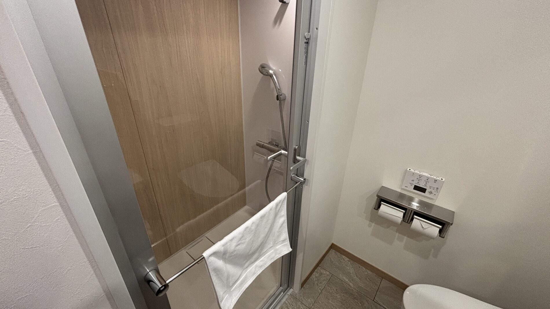 大浴場があるので、部屋にはバスタブはなくシャワーのみだが、シャワールームには扉がついていて床が水浸しにならないタイプ。