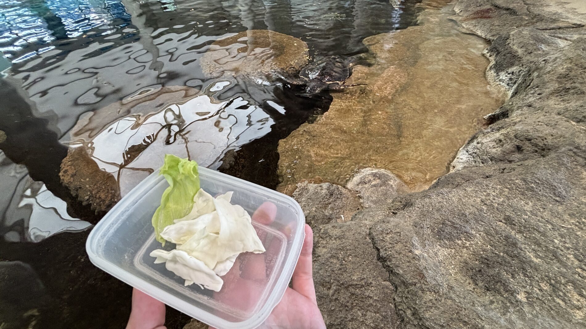 ウミガメのご飯は、ちぎったキャベツ。これをウミガメの顔の前に投げ入れると食べてくれる。
