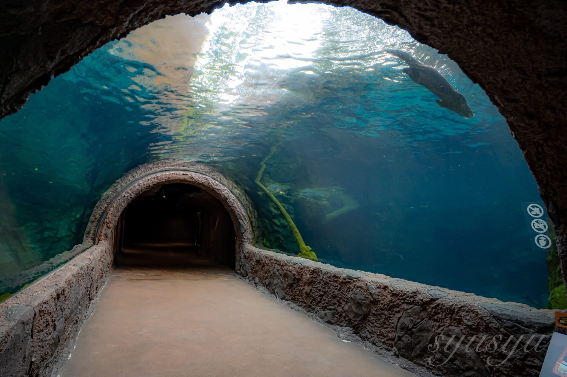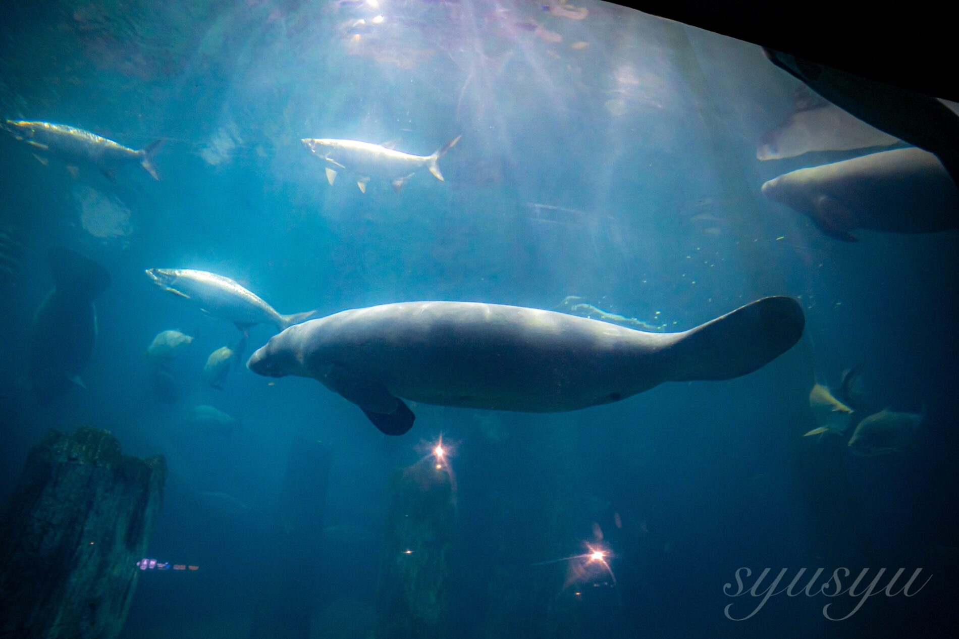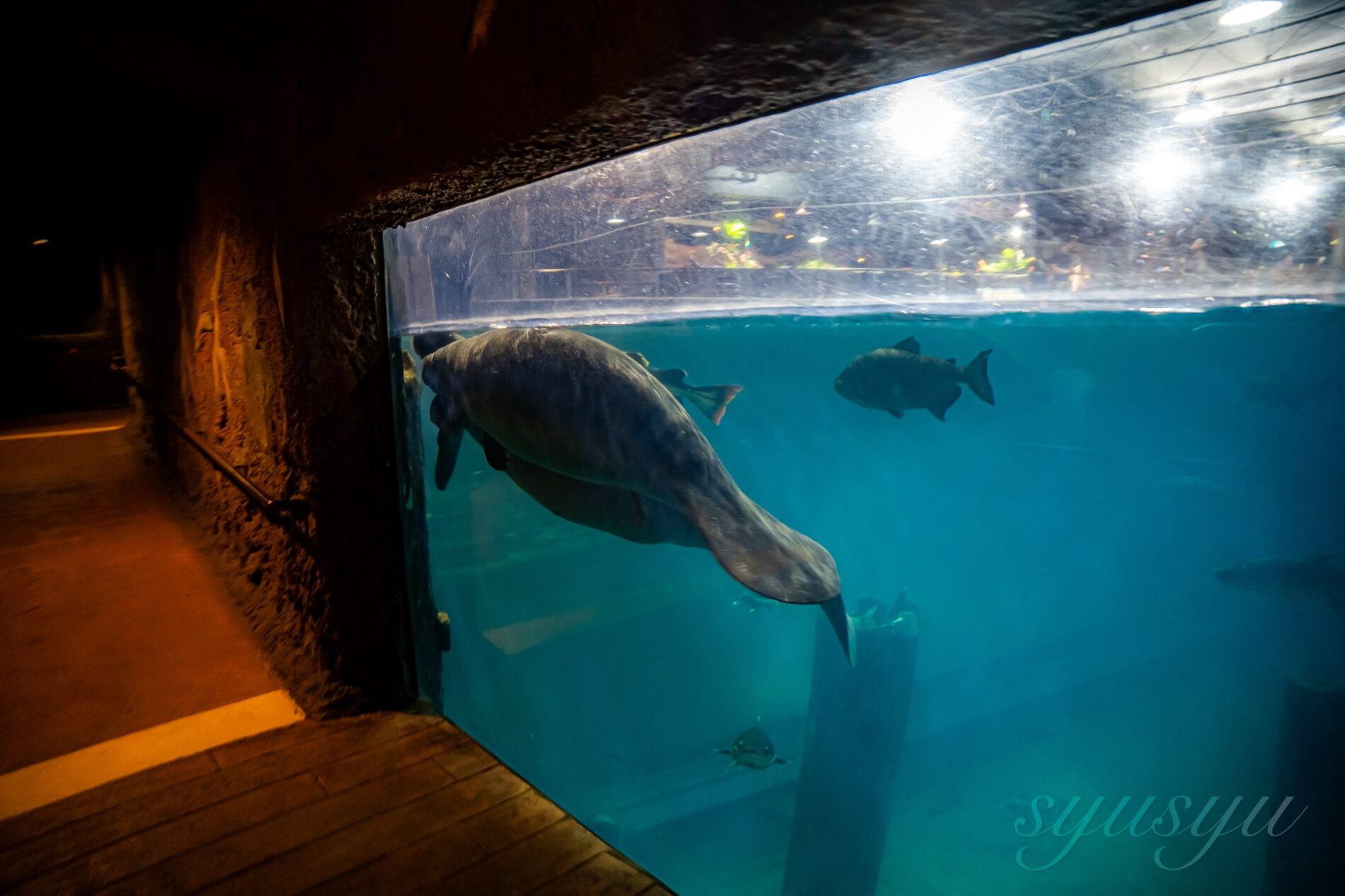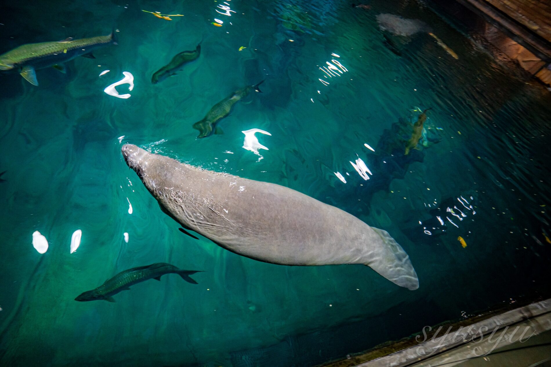 マナティの大水槽。何頭も泳いでいて迫力がある。マナティにも種類があるのだが、ここで見られるのはアマゾンマナティ。淡水域にのみ生息して、マナティの中で一番小柄な種類。