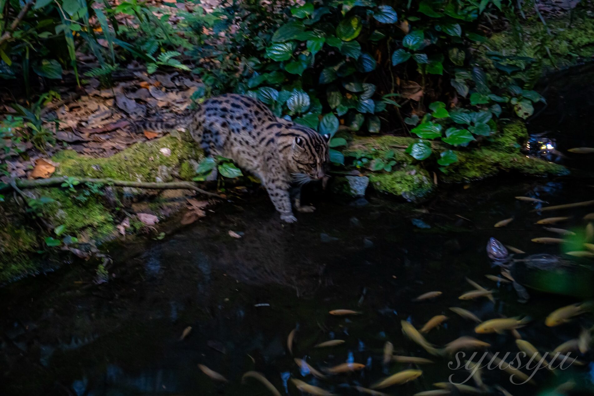スナドリネコが池の魚をハンティングしている。ぶれているがこれでも比較的よく撮れた方。