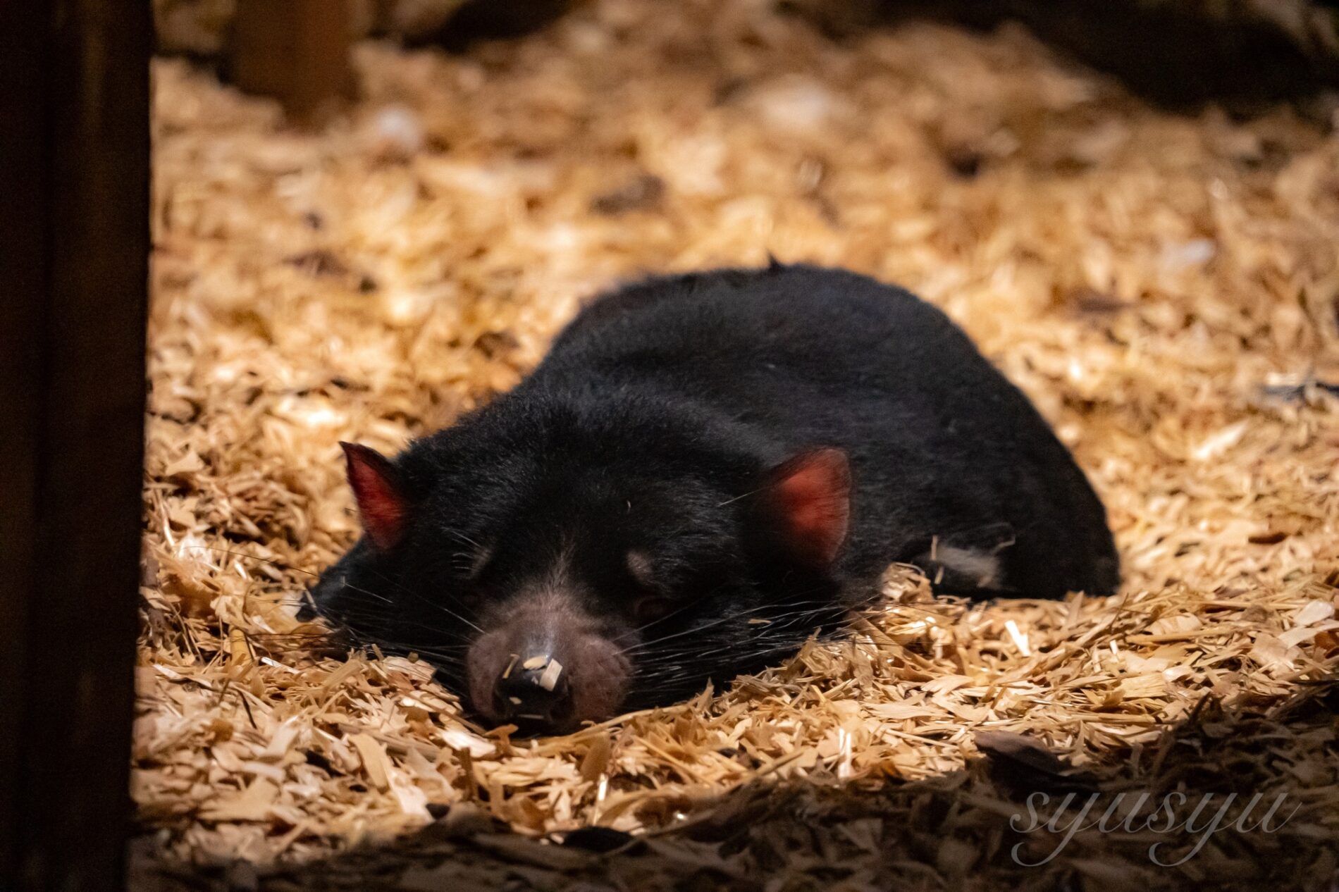 タスマニアデビル。寝ているだけなら子犬のようで可愛らしい。活動している個体は悪魔のような声で吠えていた。