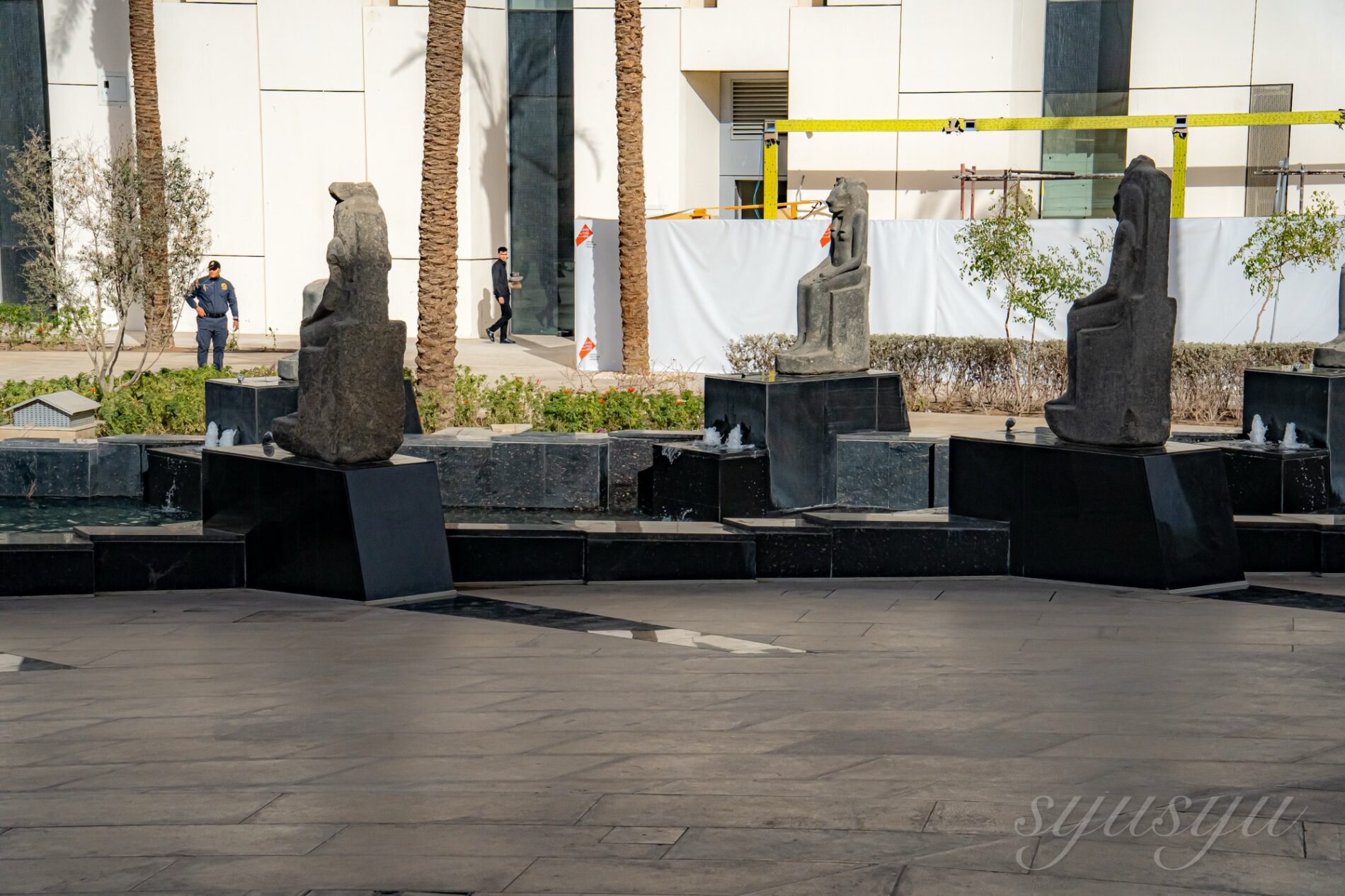 太陽の船の展示エリアに行く中庭。噴水のようになっている像は流石にレプリカだろうと思っていたら、ガイドが「これら全部レプリカではなくオリジナル」と言っていた。古代の遺物が多すぎて扱いがあまりにもカジュアル。