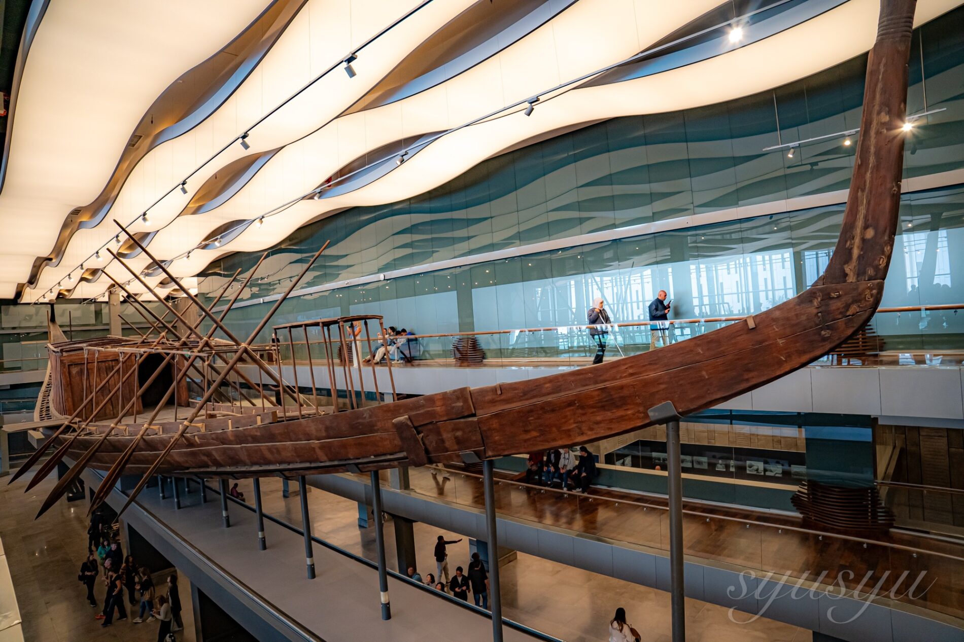 博物館本体とは別の専用の建物で展示されている太陽の船。記録に残る世界最古の大型木造船の一つで、こちらは第一の船。第二の船は早稲田大学のチームが復元を進めている。