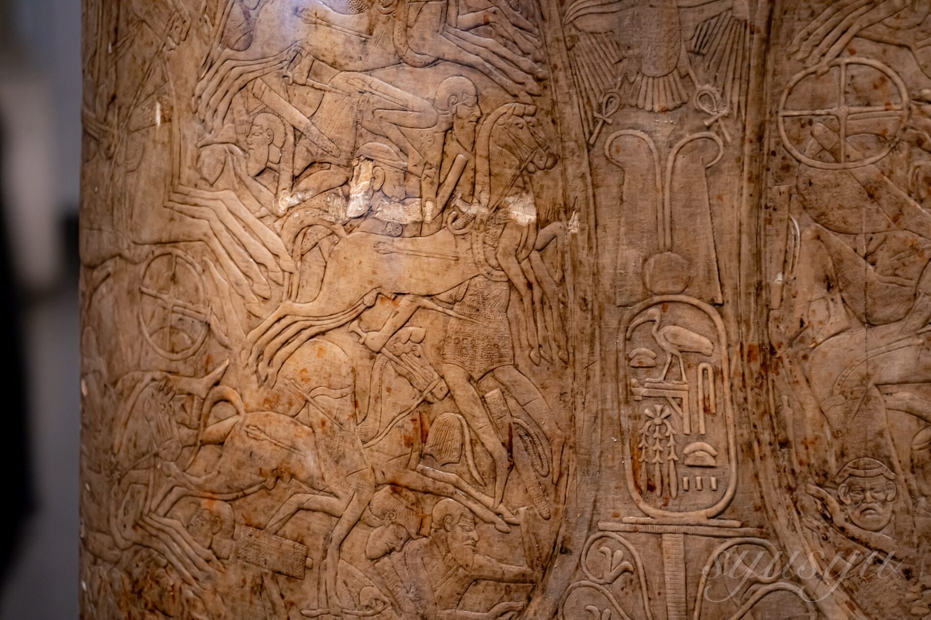 こちらのレリーフは戦いの様子を描いたものだが、ウマの足が幾重にも重なって描かれているのがわかるだろうか。これは馬が早く走る脚の残像を表現しているそうだ。現地ガイドは“マンガ”と言っていた。