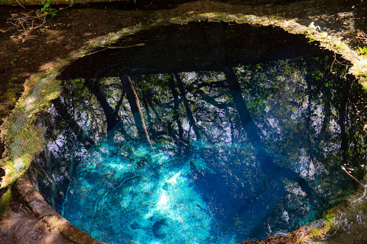 紡績工場の井戸として使われていたもので、幻想的な澄んだ青色をしている。